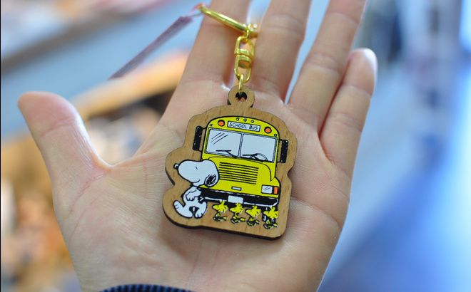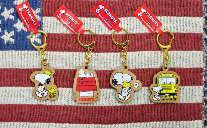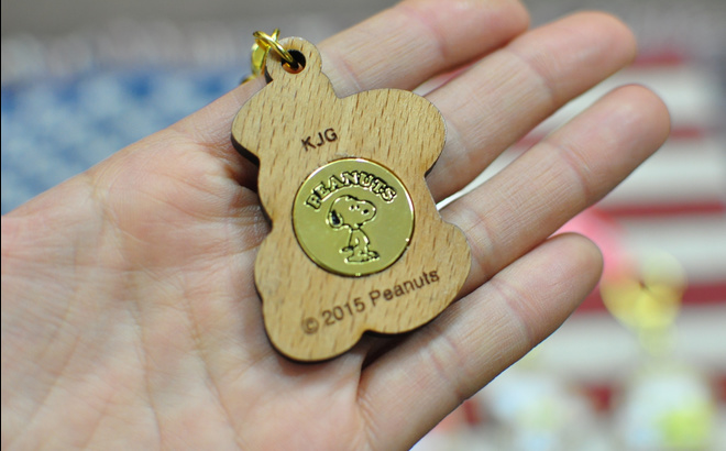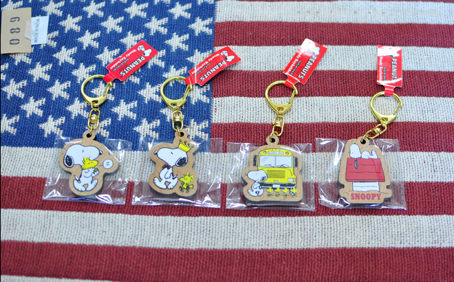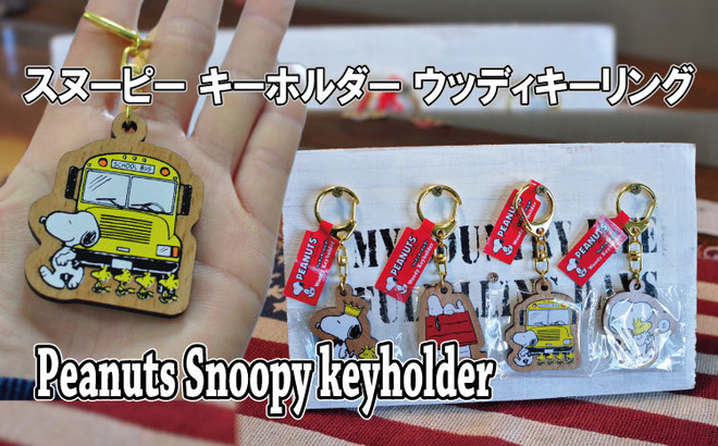 ウッディキーリング!生誕65周年を迎えて人気上昇中の【Peanuts/Snoopy】グッズにまたまた可愛いnewアイテム登場!!こちらはとっても可愛い【ウッディキーホルダー】ナチュラルなウッド素材にかわいいプリントがされています。裏面にはゴールドのメタルプレートも付いています。